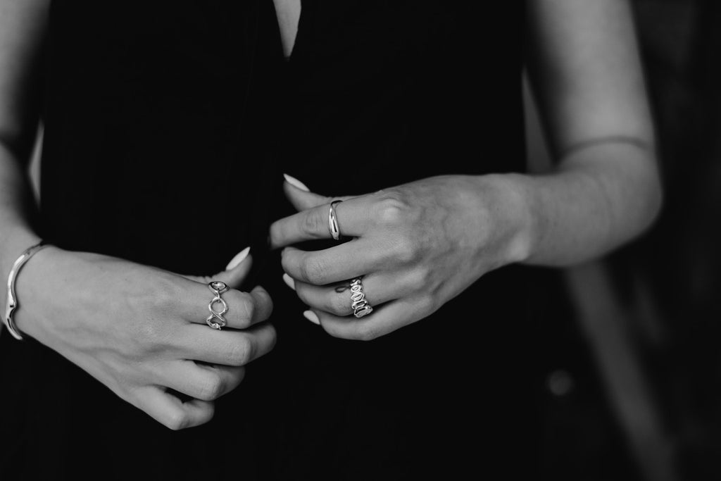 シルバーは、毎日身につけて扱い、肌や身の回りの生地や素材で磨き上げれば、洗練された外観を維持します。ジュエリーを長期間保管する場合は、酸化を最小限に抑えるために密閉容器に保管することをお勧めします。少し光沢を出したい場合は、銀磨きクロスや重曹などを使ったケアをお勧めします。