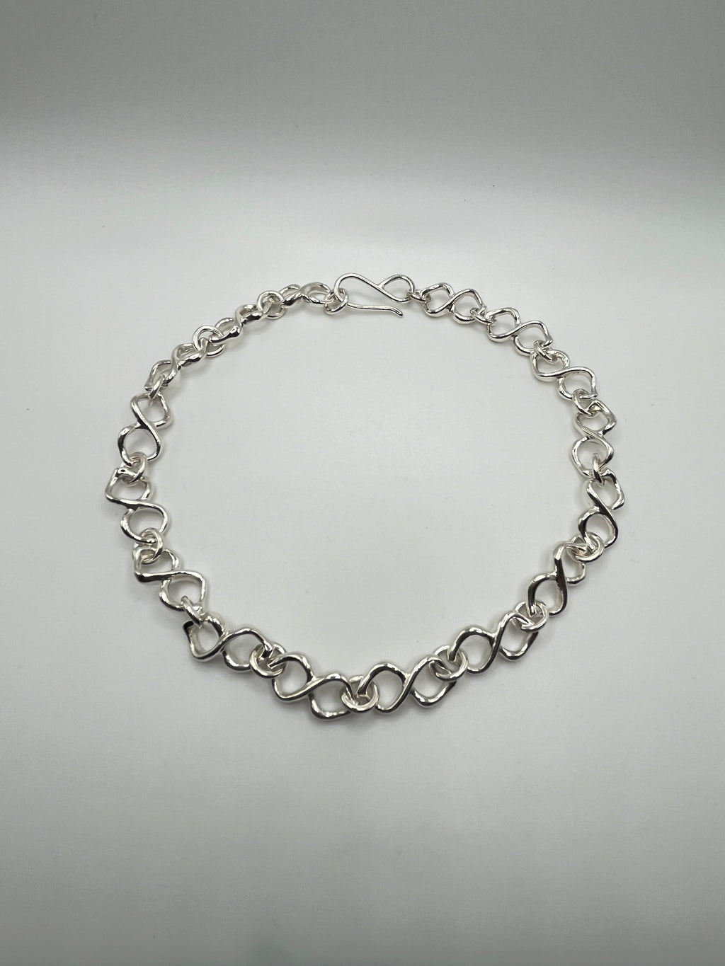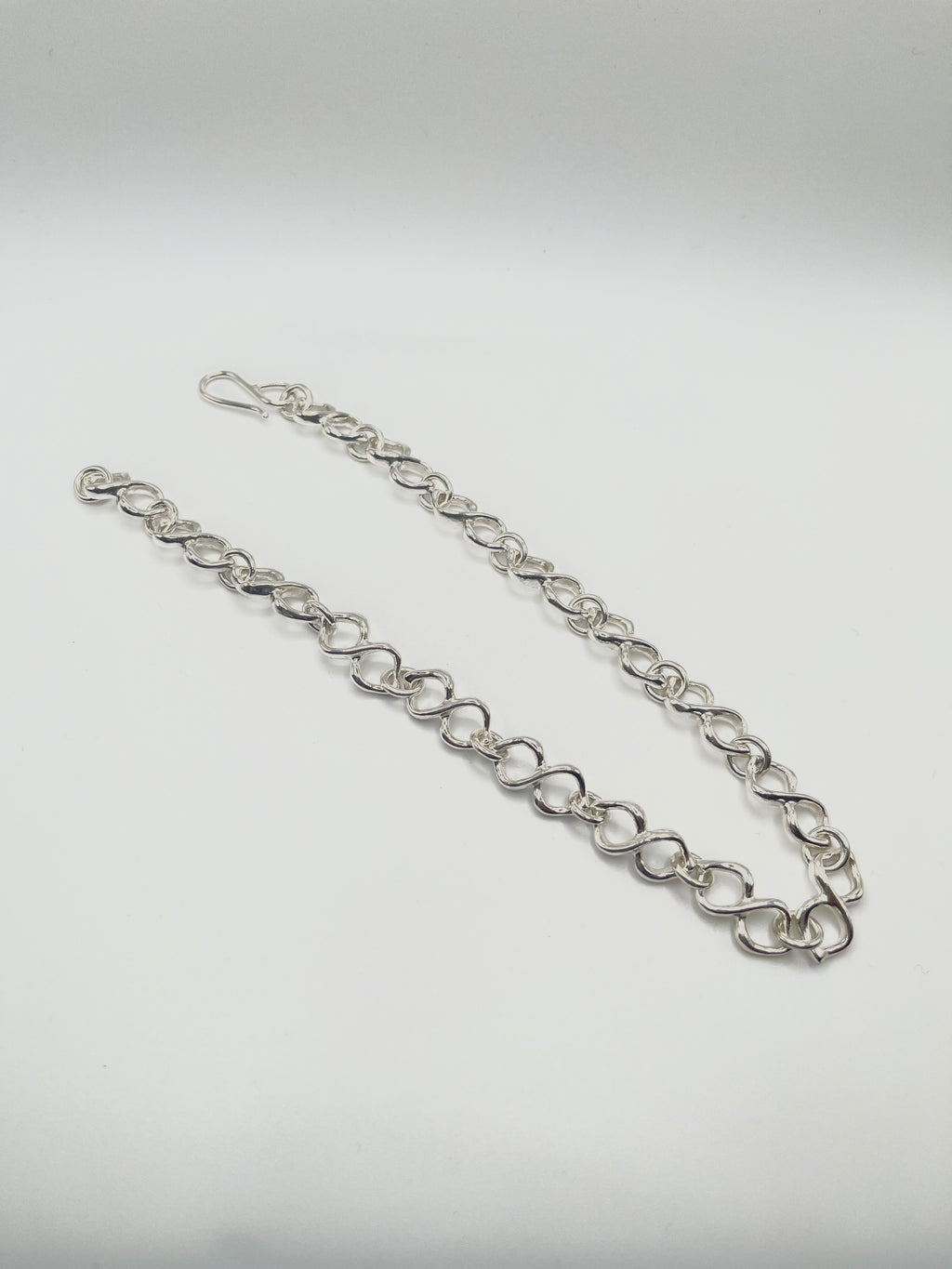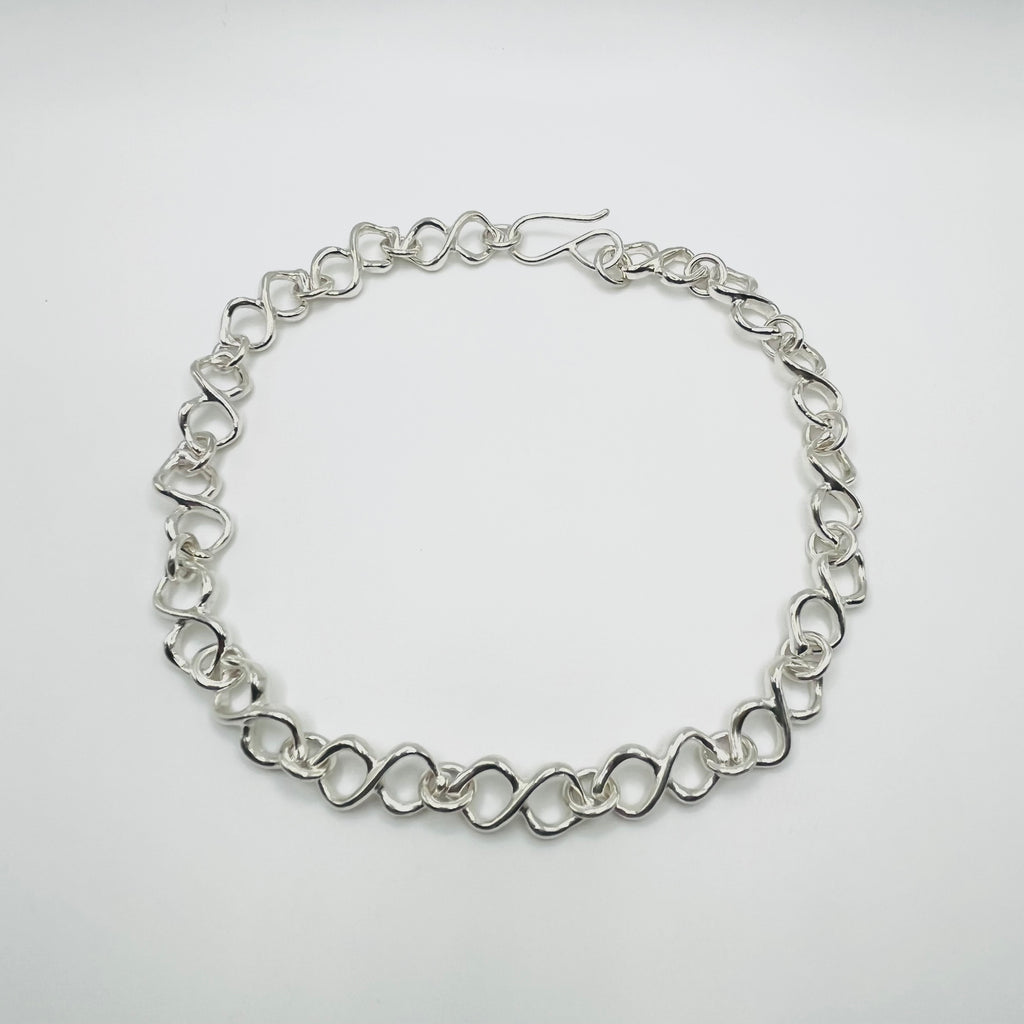 Chaque maillon représente une lemniscate, plus communément appelée symbole de l'infini. Composé de 16 maillons. Argent sterling. Longueur totale : 35,5 cm (14 pouces).